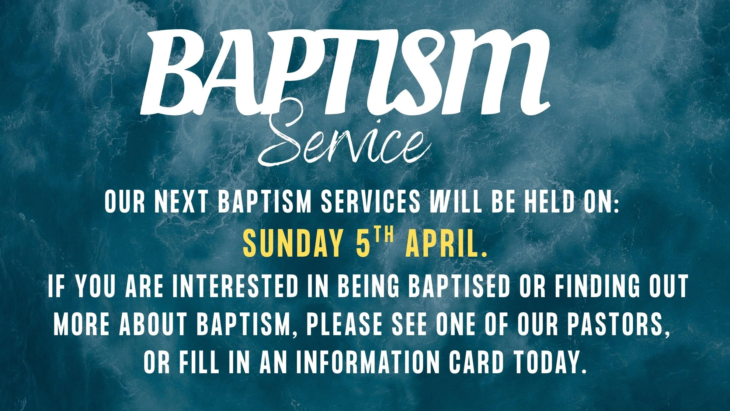 If you are interested in being baptised or finding out more about baptism, please see one of our Pastors, fill in an information card or click below to find out more.